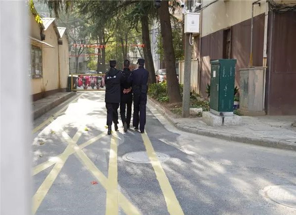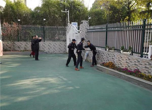 演練開始,一對中年夫婦以看望孫子為名要進入幼兒園,保安進行正常詢問,兩人言辭含糊不予配合,期間中年男子乘機闖入幼兒園,一名保安控制住中年婦女,另外兩名名保安迅速用防暴叉控制男子,男子拿出兇器,保安通知老師報警和保護孩子撤離。